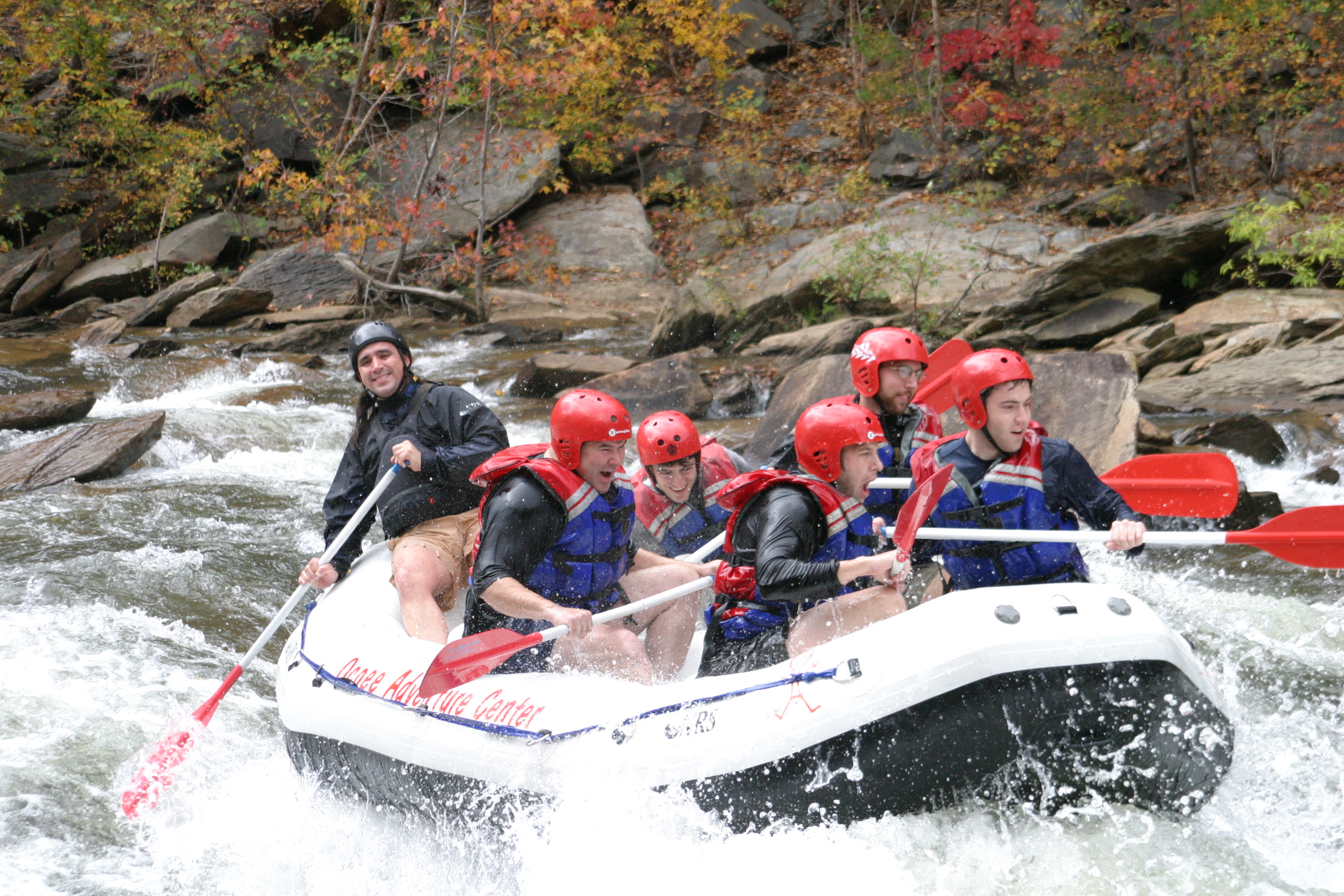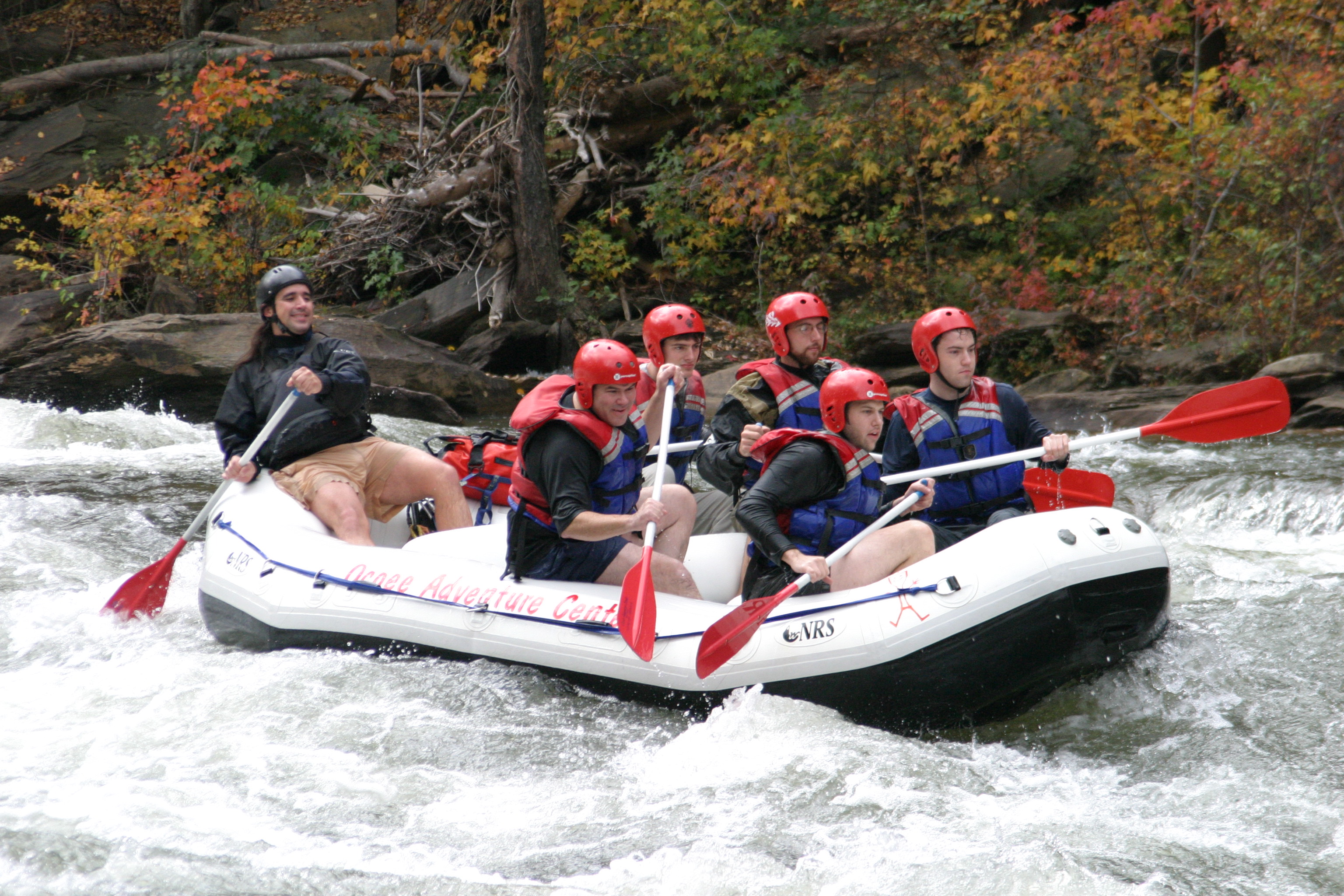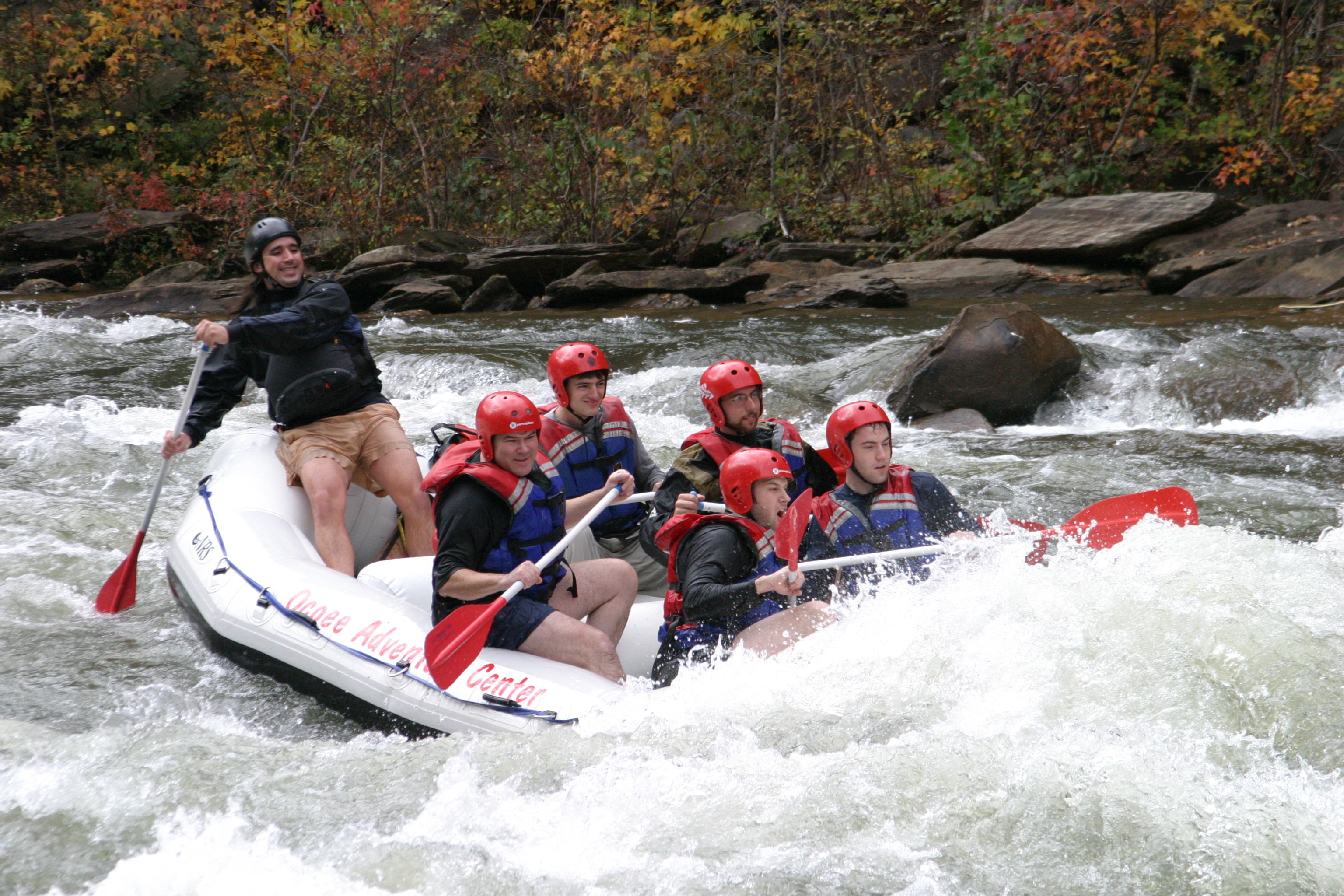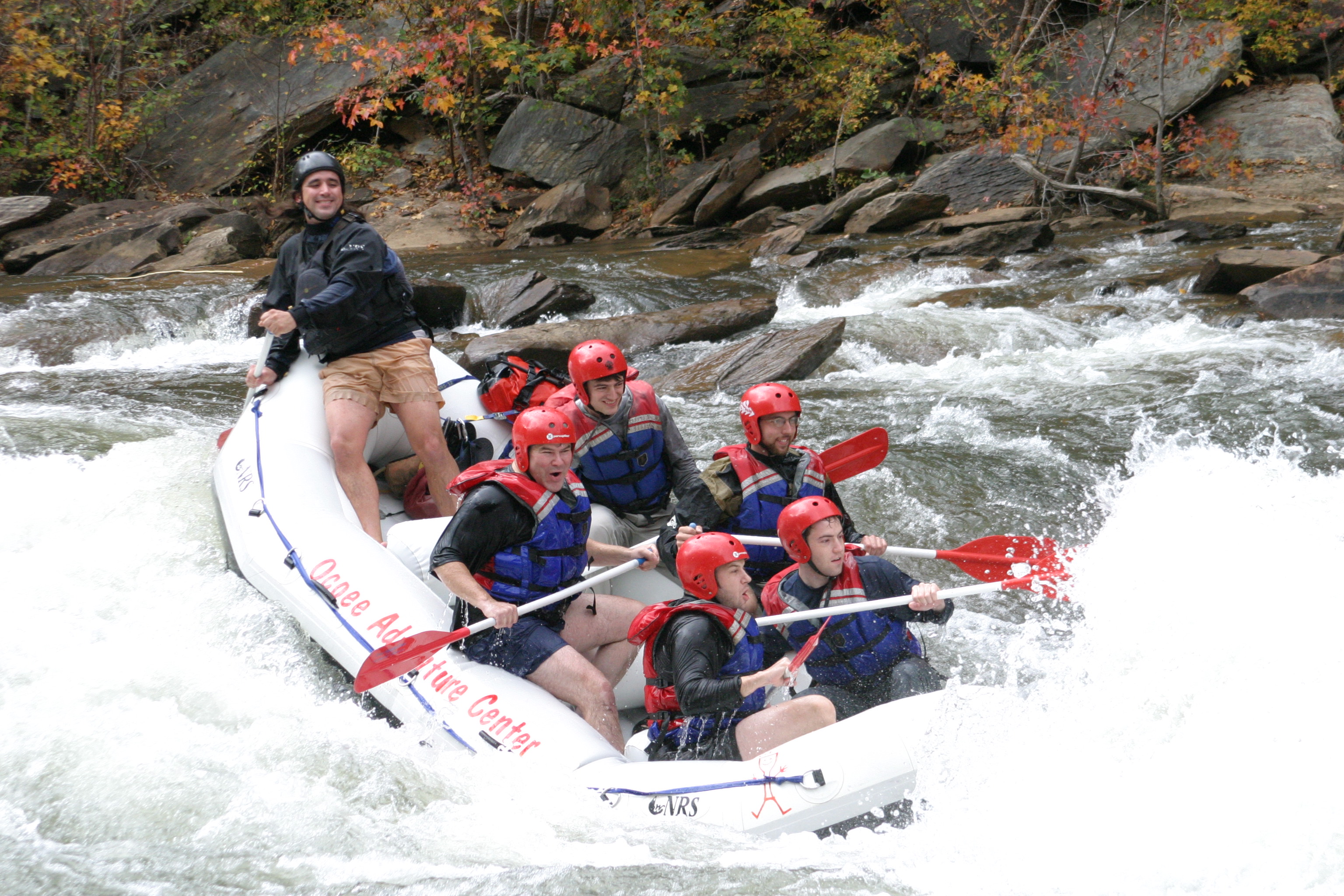 These photos are from the last day of whitewater rafting on the Ocoee River, TN for 2005. We ran the river with the Ocoee Adventure Center. On our trip was: Stephen Colegrove, Chris Ernst, Russ Colegrove, Jason diMonda, Russell Colegrove, Jr.. Our guide was Michael Firestone. We had unusually warm weather with plenty of fall foliage to add color. The water was cool and brisk but we managed without splash jackets or wet suits. Everyone stayed in the boat but we all were wet as we did a lot of surfing and drove the bow underwater many times. These photos of handsome men at work and play were taken at Double Trouble.