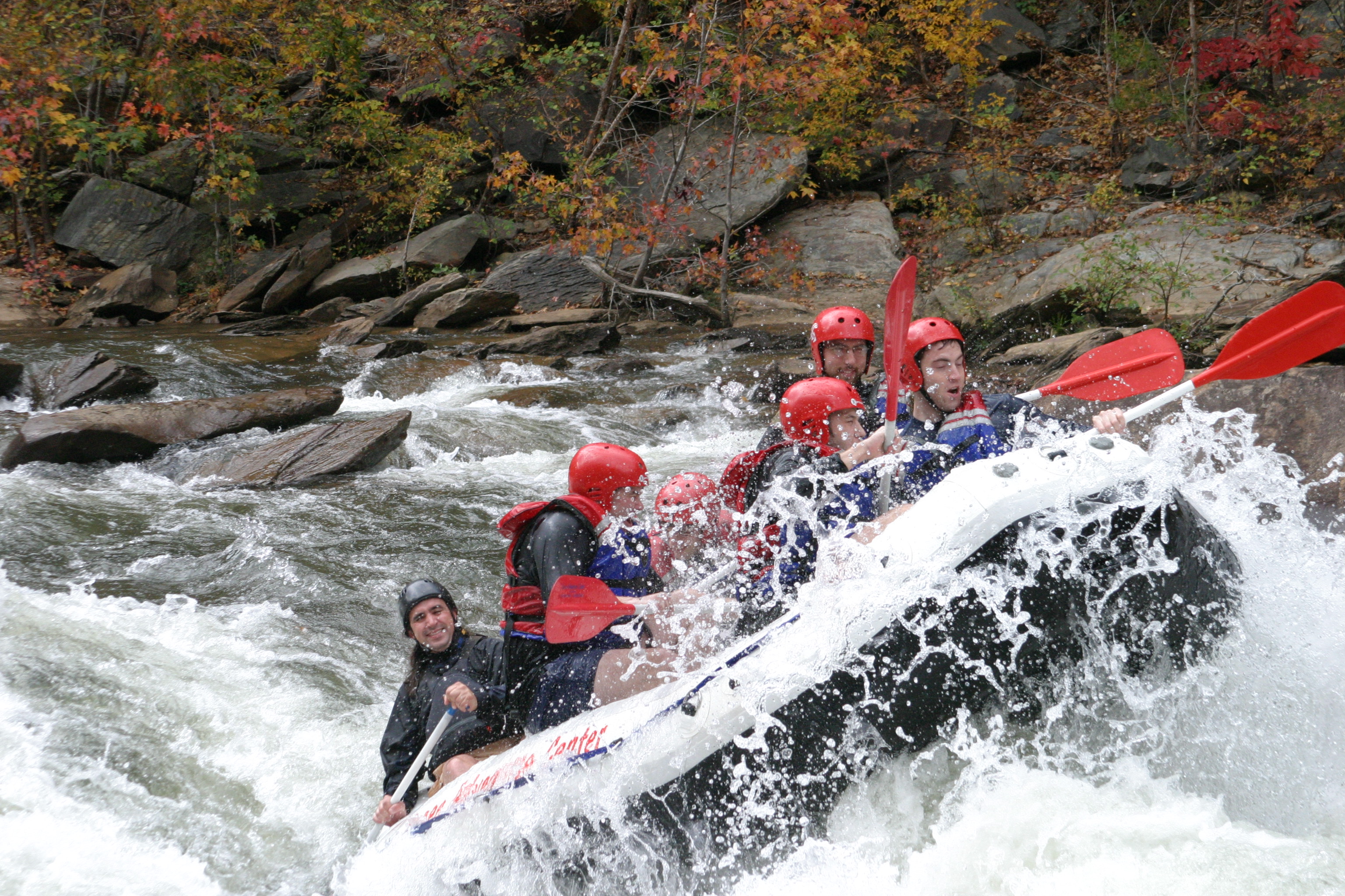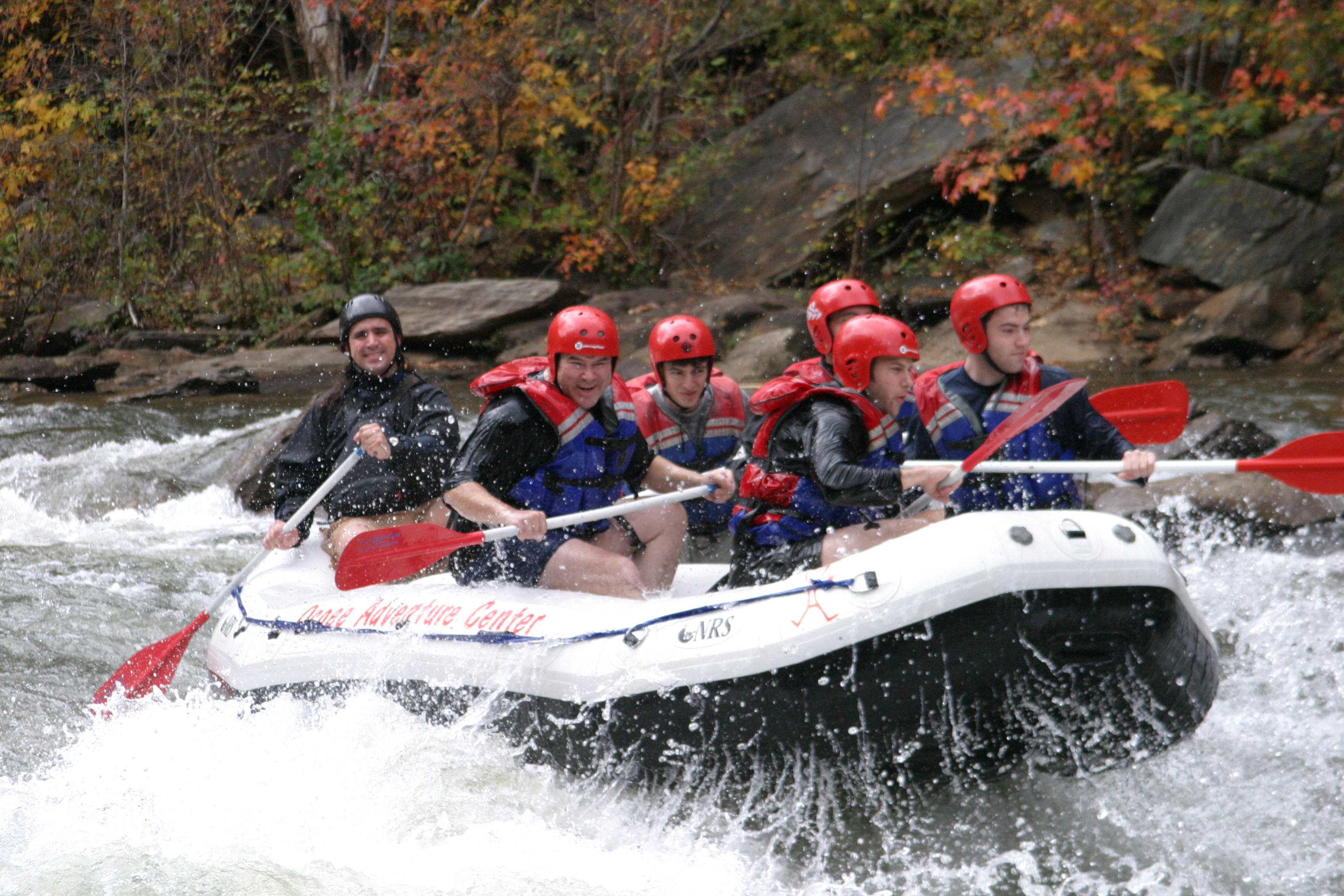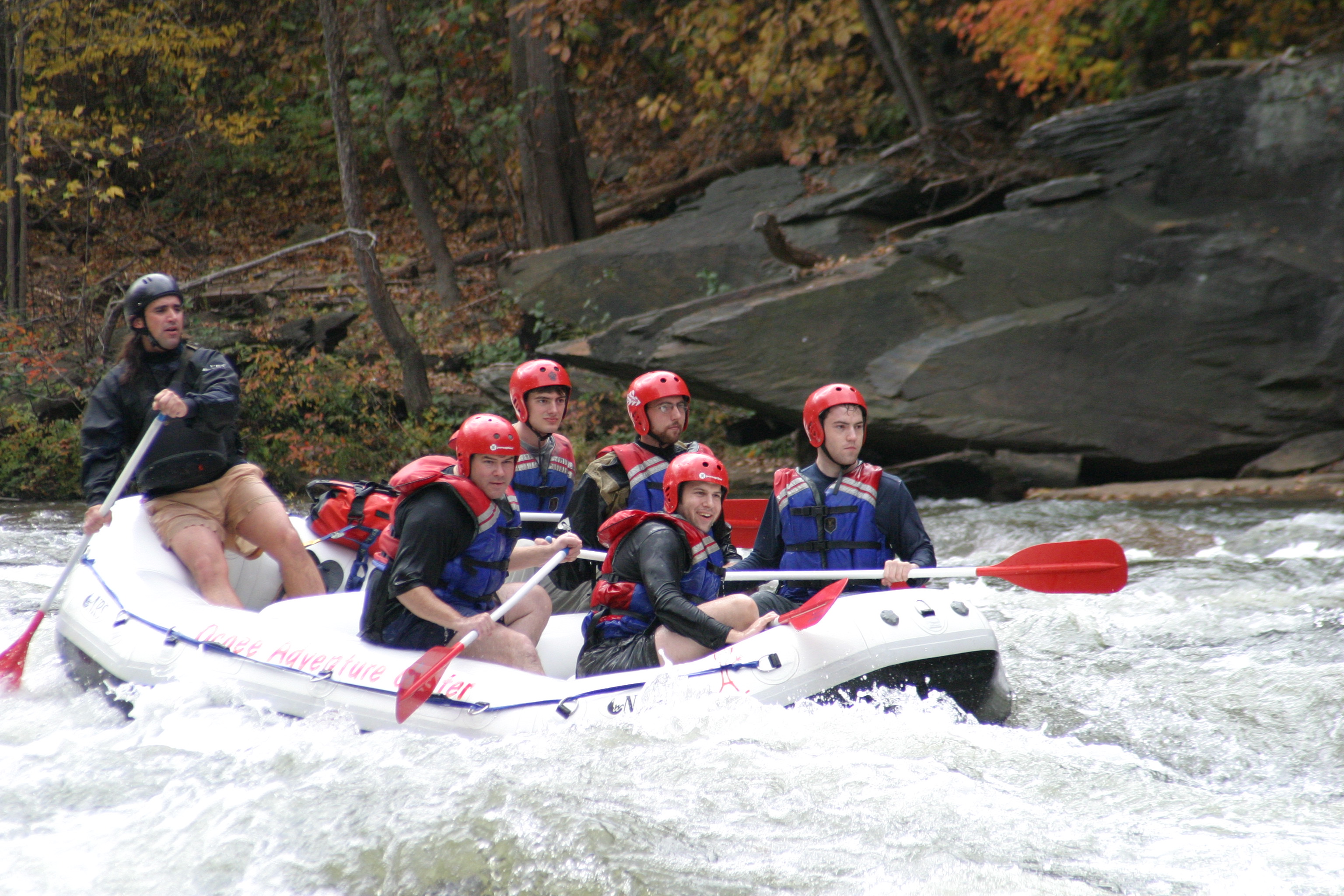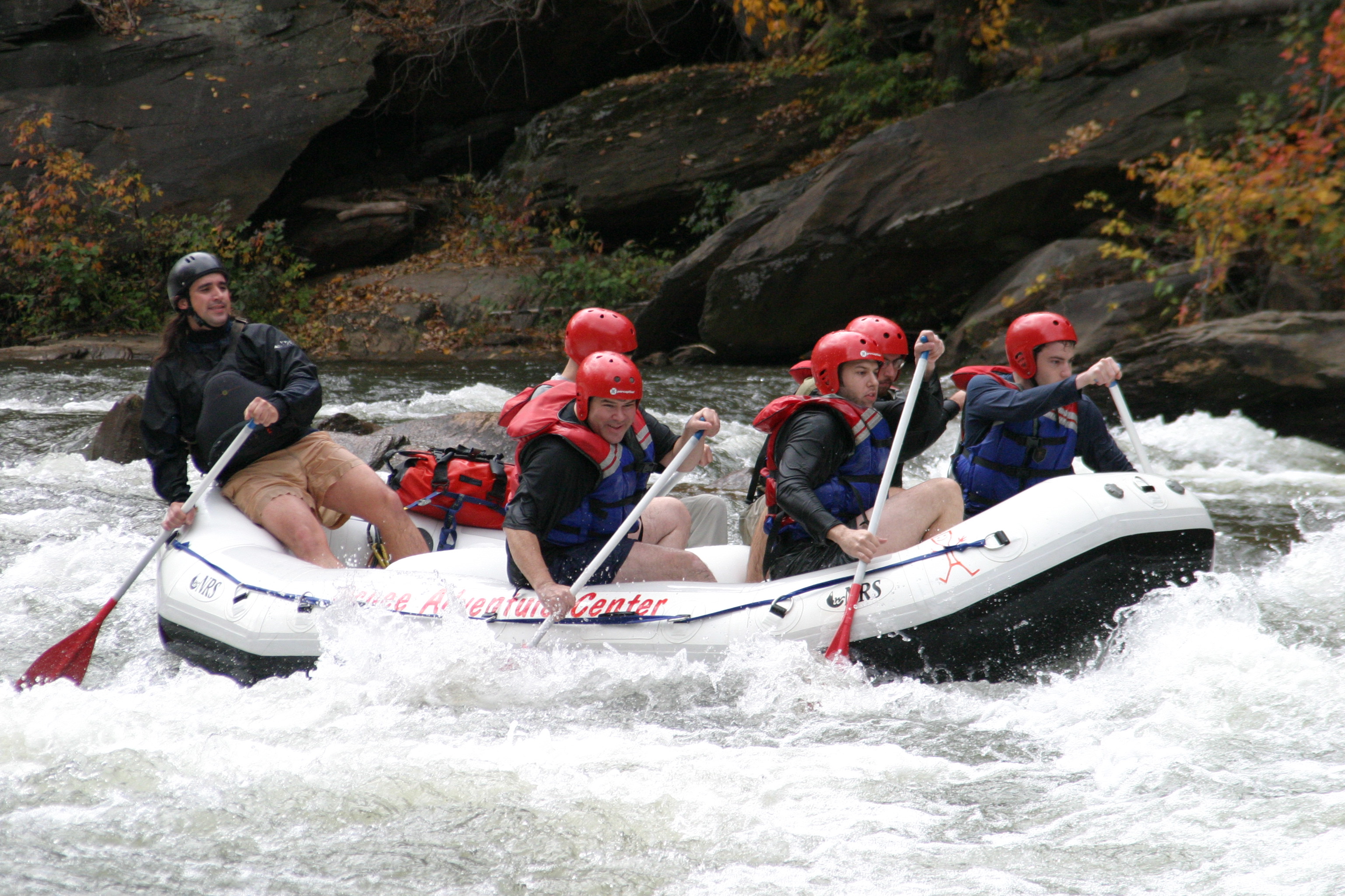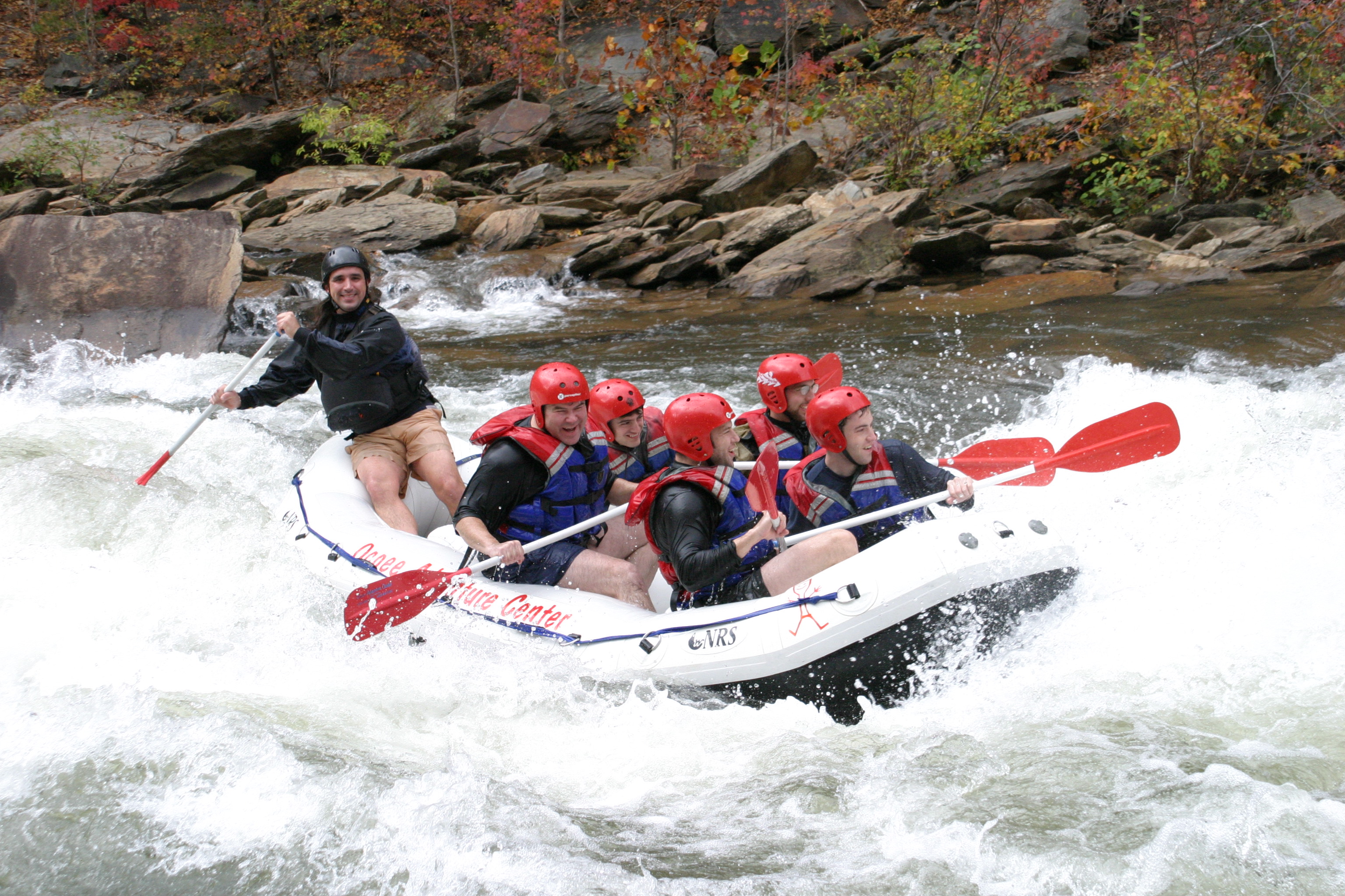 These photos are from the last day of whitewater rafting on the Ocoee River, TN for 2005. We ran the river with the Ocoee Adventure Center. On our trip was: Stephen Colegrove, Chris Ernst, Russ Colegrove, Jason diMonda, Russell Colegrove, Jr.. Our guide was Michael Firestone. We had unusually warm weather with plenty of fall foliage to add color. The water was cool and brisk but we managed without splash jackets or wet suits. Everyone stayed in the boat but we all were wet as we did a lot of surfing and drove the bow underwater many times. These photos of handsome men at work and play were taken at Double Trouble.